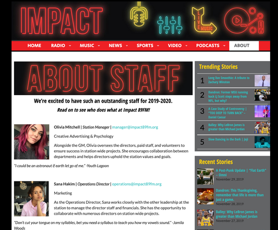 Throughout my time as Website Director, a variety of branding and website redesigns occurred. A website is the way Impact interacts with its audience. Through the help of our graphic design team, our site has made some serious improvements to the visual aesthetic, navigation, and user experience.